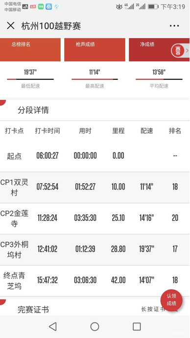 离开CP3,还剩下最后13公里(爬升1000米),计划中的12小时完赛应该没有问题的了。还是不紧不慢,因为天气晴好,星期六的山上有很多游人。也许是红色的道引丝带太亮丽,游人留作记念带走了吧,跑错道在42公里的后半程发生好几次,所幸都及时更正了。下去就是浙大校区了,心里竟然有点不舍,我的第一次越野天狼杭百越野赛就要结束了。意犹未尽,想念那些台阶,及拾阶而下的节奏,犹如舞动的音乐。还有那些在阳光下奔跑过的山峦,及碰触过我的树枝,细细的腿上划痕,好像刻在我的心中,留恋与狼共舞在西湖之巅的时刻。